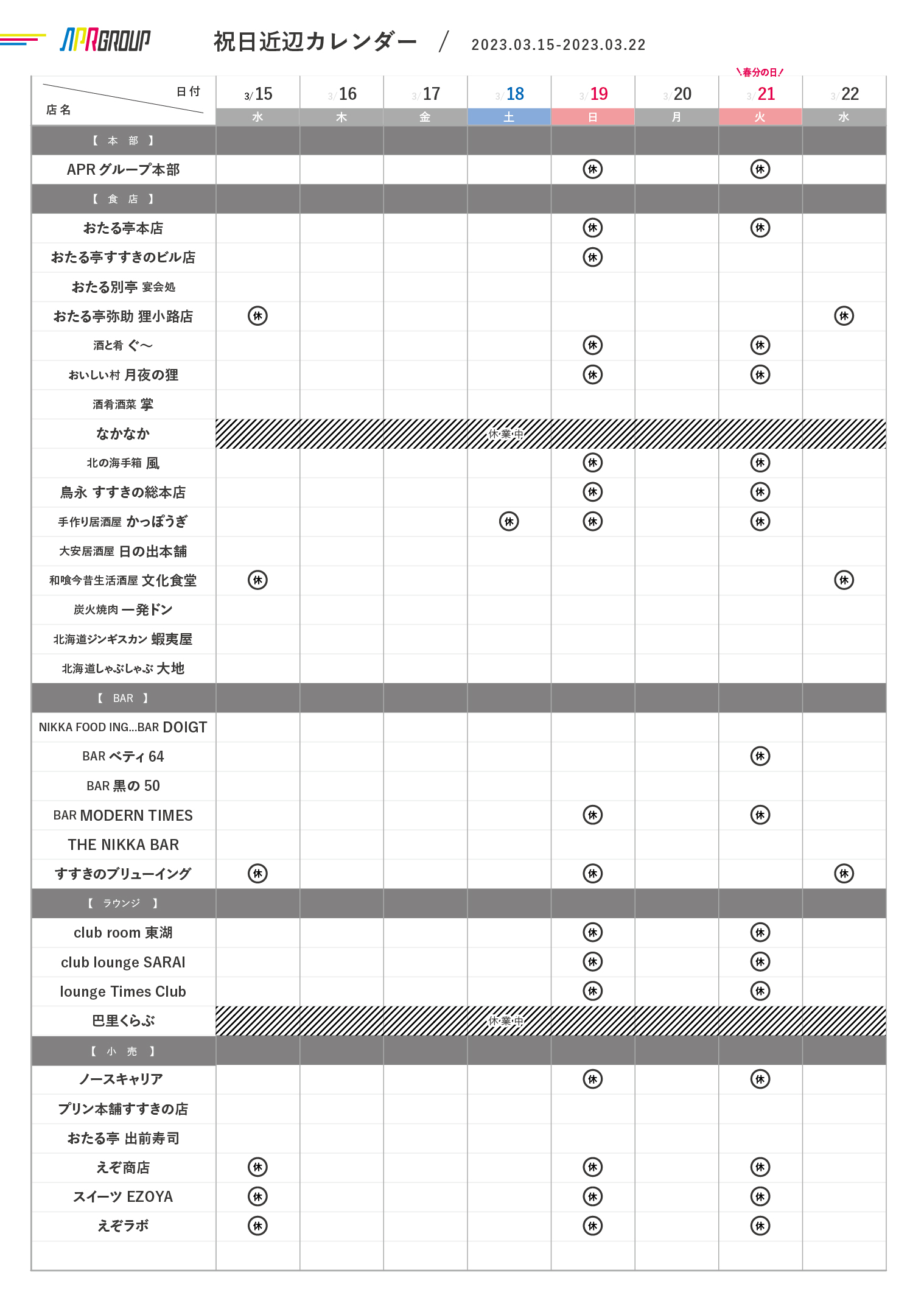 2023/3/15-3/22 の間の営業カレンダーを掲載しました。